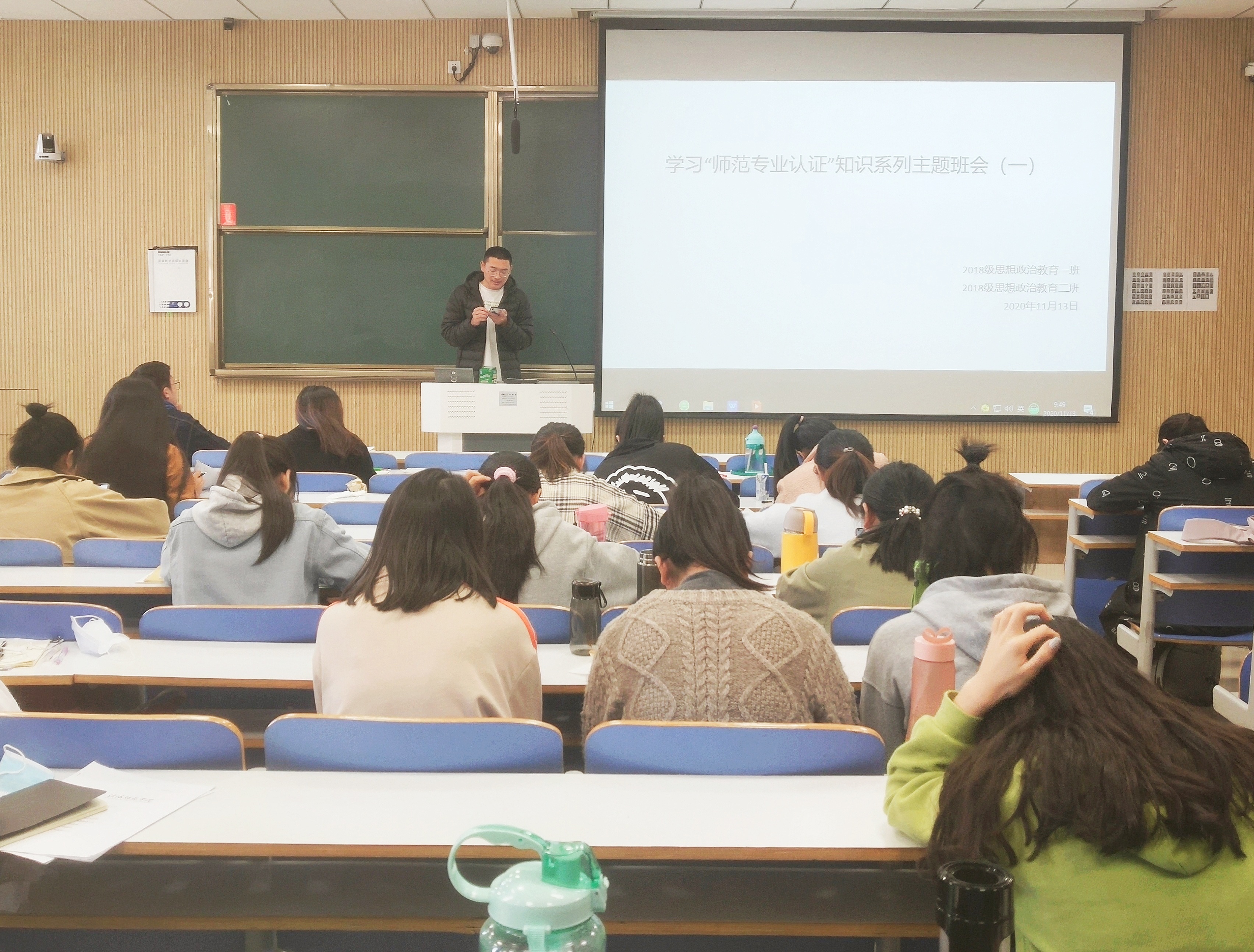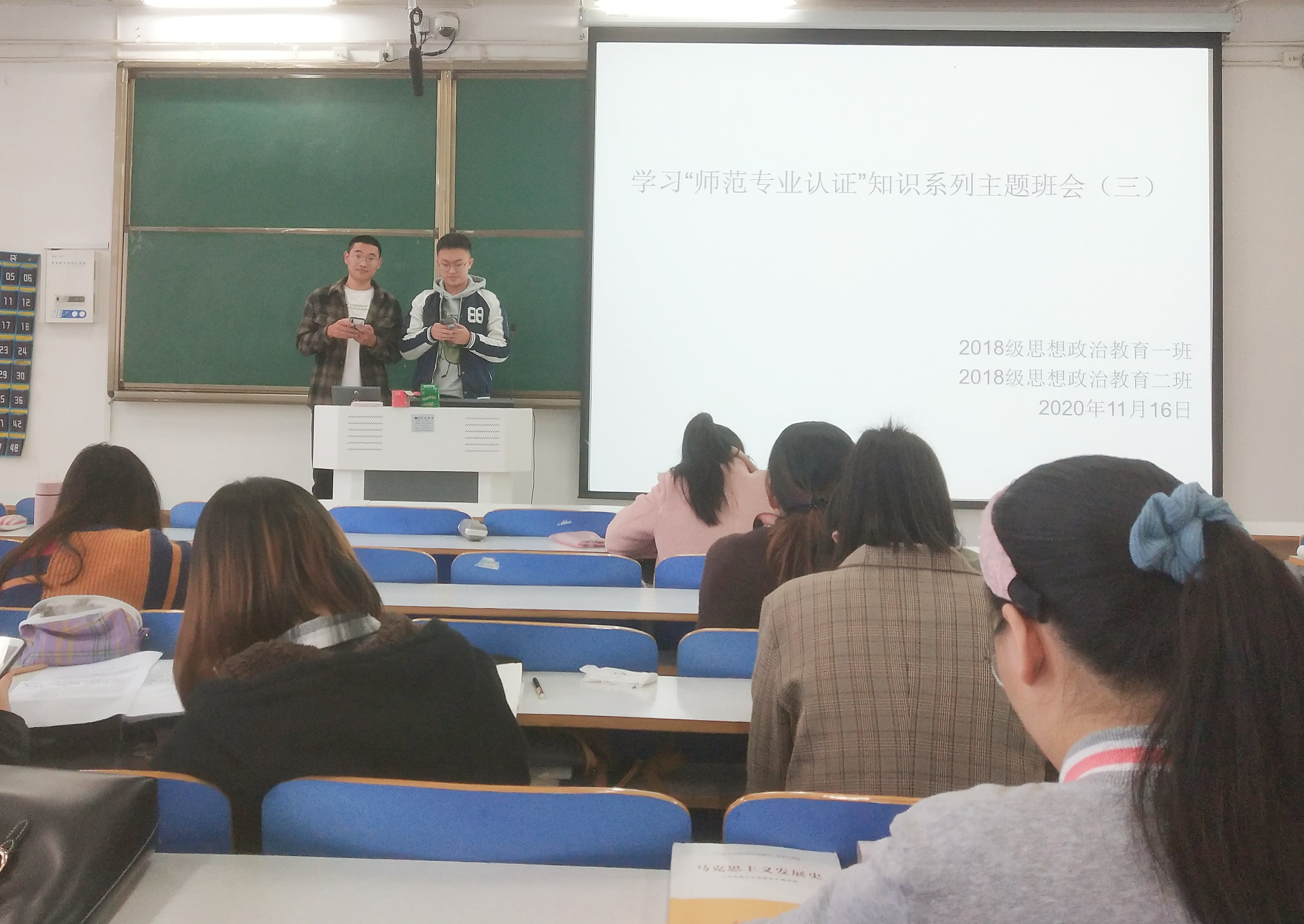 11月13日——11月16日,太阳集团tyc59972018级思想政治教育二班在社科楼515教室顺利开展学习“师范专业认证”知识系列主题班会。会议由班长杨康主持。