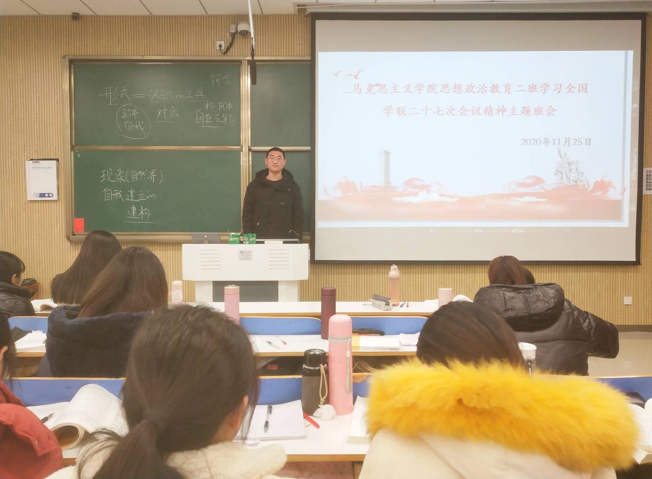 11月25日上午,太阳集团tyc59972018级思想政治教育二班在社科楼515教室顺利开展学习中华全国学生联合会第二十七次代表大会精神主题班会。会议由班长杨康主持。