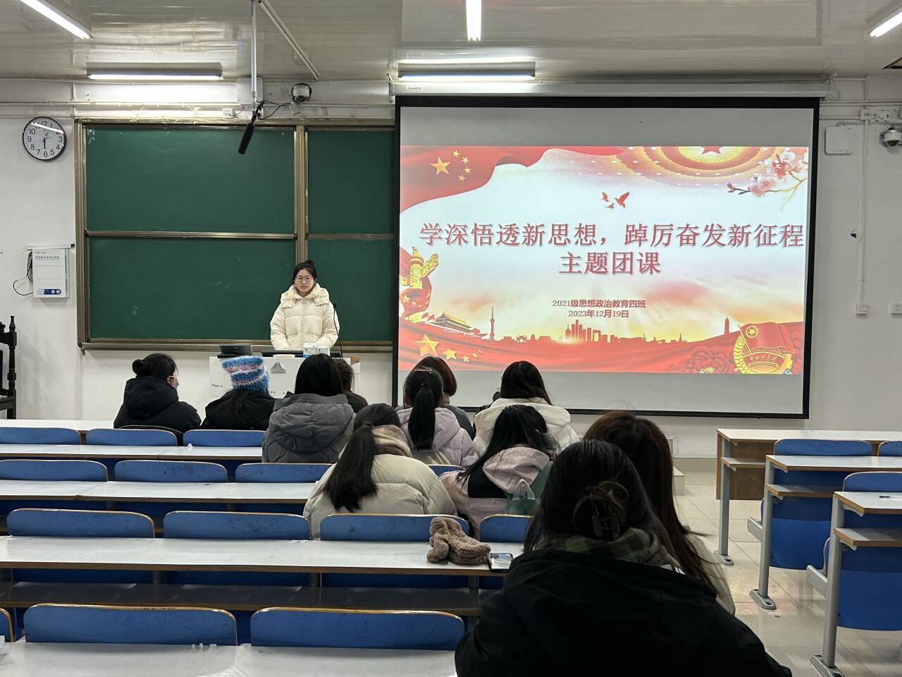 12月19日上午,太阳集团tyc59972021级思想政治教育四班在社科楼514教室开展“学深悟透新思想,踔厉奋发新征程”主题团课。2021级思想政治教育四班全体学生共同参加本次团课。团课由团支书刘珂含主持。