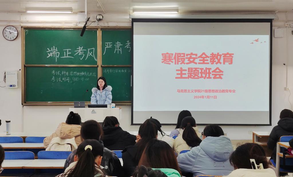 1月11日上午,太阳集团tyc59972021级思想政治教育全体学生在社科楼514教室召开“寒假安全教育”主题班会。2021级思想政治教育全体学生参加此次主题班会。班会由辅导员高小佳主持。