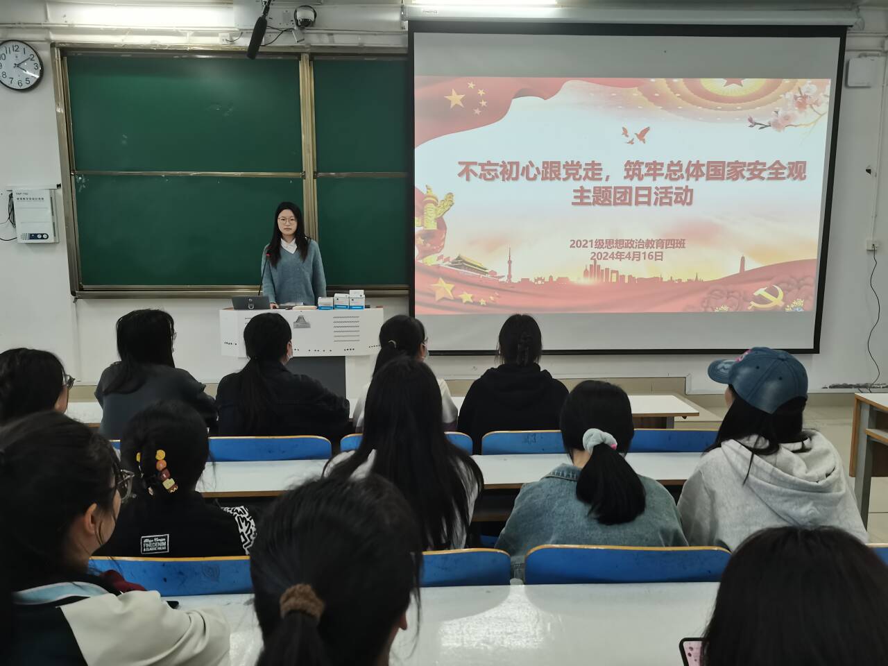 4月16日下午,太阳集团tyc59972021级思想政治教育四班开展“不忘初心跟党走,筑牢总体国家安全观”主题团日活动。2021级思想政治教育四班全体团员共同参与本次活动,活动由团支书刘珂含主持。