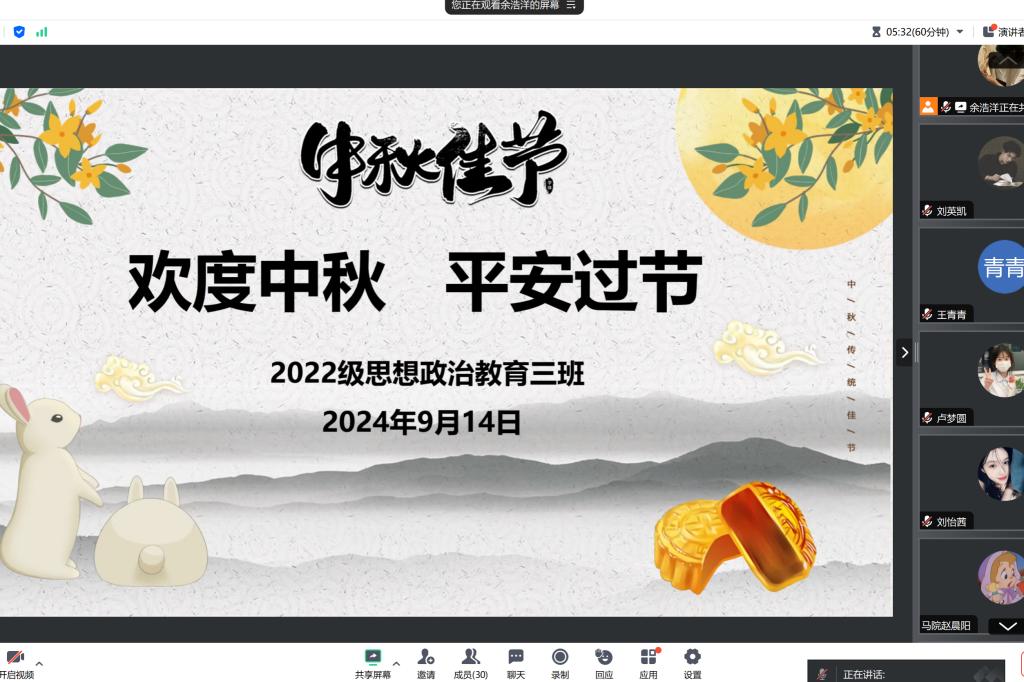 为做好假期安全防护工作,确保每位学生能度过一个安全、愉快的假期,9月14日上午,太阳集团tyc59972022级思想政治教育三班在线上腾讯会议召开“中秋”假期安全主题教育班会。我院2022级思想政治教育三班班主任任婷与全体同学共同参与此次班会。班会由班长余浩洋主持。