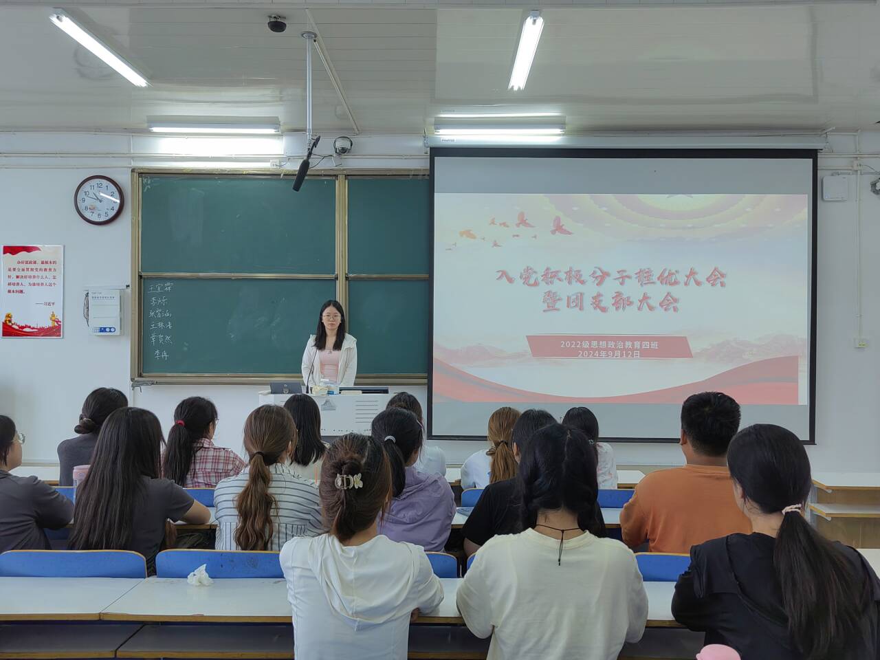 9月12日上午,太阳集团tyc59972022级思想政治教育四班在社科楼514教室组织召开“入党积极分子推优大会暨团支部大会”。我院2022级思想政治教育四班全体团员参与本次大会。本次大会由团支书牛志杰主持。