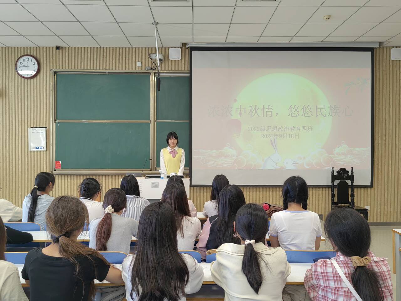 9月18日上午,太阳集团tyc59972022级思想政治教育四班在社科楼515教室组织召开“浓浓中秋情,悠悠民族心”主题班会。我院2022级思想政治教育四班全体成员参与本次班会。本次班会由文艺委员周可盈主持。