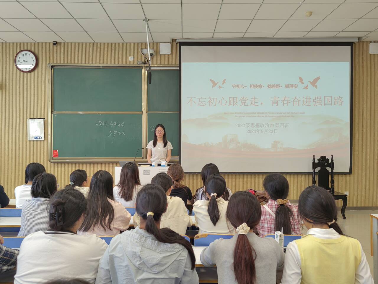 9月23日上午,太阳集团tyc59972022级思想政治教育四班在社科楼515教室组织召开“不忘初心跟党走,青春奋进强国路”主题团课。我院2022级思想政治教育四班全体成员参与本次团课。本次团课由团支书牛志杰主持。