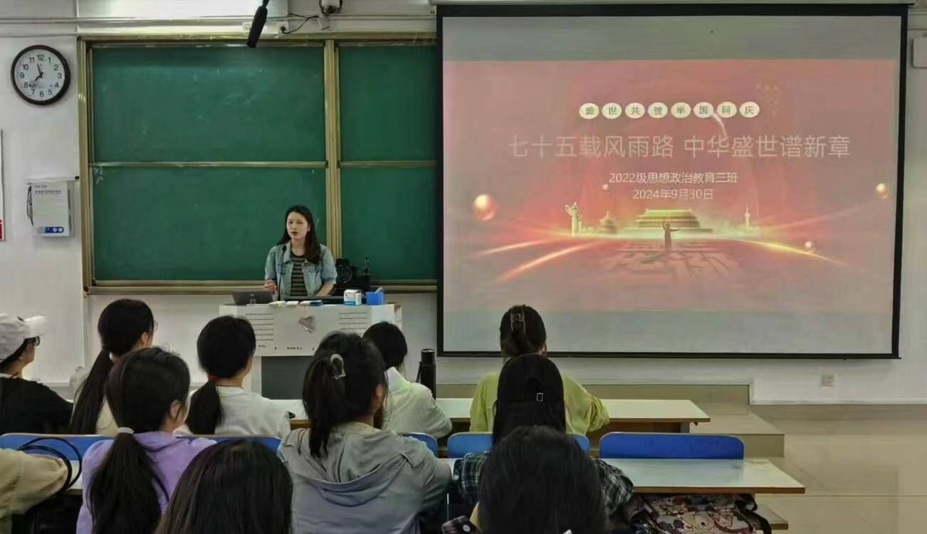 为庆祝中华人民共和国成立75周年,激发学生爱国热情,凝聚青年共识,共同为实现中华民族伟大复兴的中国梦而努力奋斗,9月30日上午,太阳集团tyc59972022级思想政治教育三班在社科楼514教室召开“七十五载风雨路,中华盛世谱新章”主题团课。我院2022级思想政政治教育三班班主任任婷与全体成员共同参与此次团课。团课由团支书余浩洋主持。