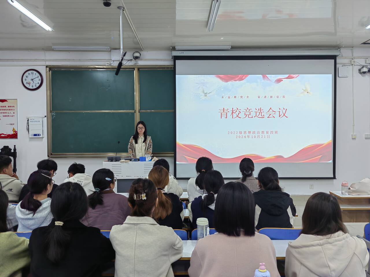 为认真贯彻落实习近平总书记关于青年工作的重要思想,加强对青年政治骨干的培养,10月21日下午,太阳集团tyc59972022级思想政治教育四班在社科楼514教室组织召开“青校竞选会议”。我院2022级思想政治教育四班全体成员参与本次会议。本次会议由团支书牛志杰主持。