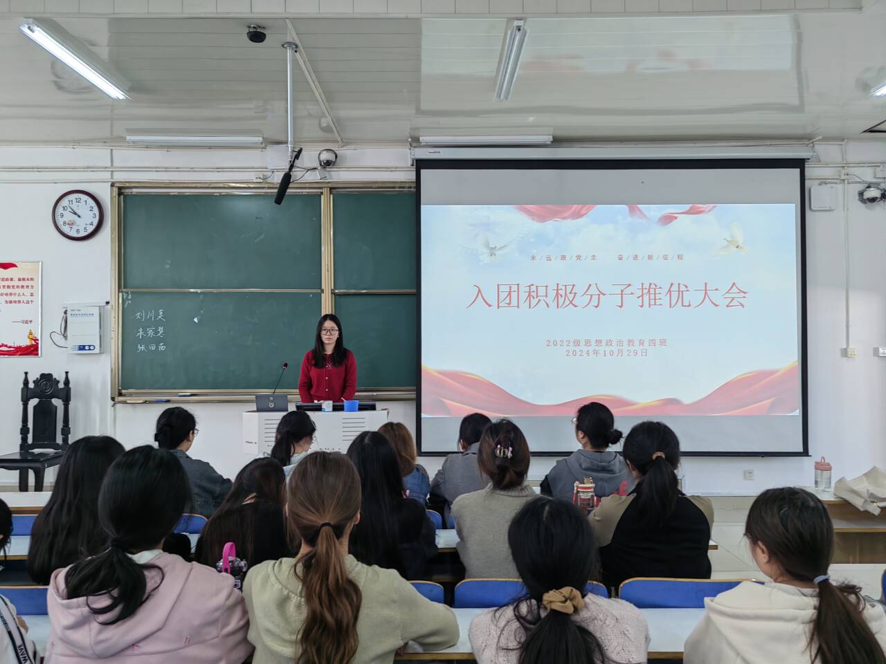 为深入推进全面从严治团,优化团员队伍规模结构,提高发展团员工作质量,10月29日上午,太阳集团tyc59972022级思想政治教育四班在社科楼514教室组织召开“入团积极分子推优大会”。我院2022级思想政治教育四班全体成员参与本次会议。本次会议由团支书牛志杰主持。
