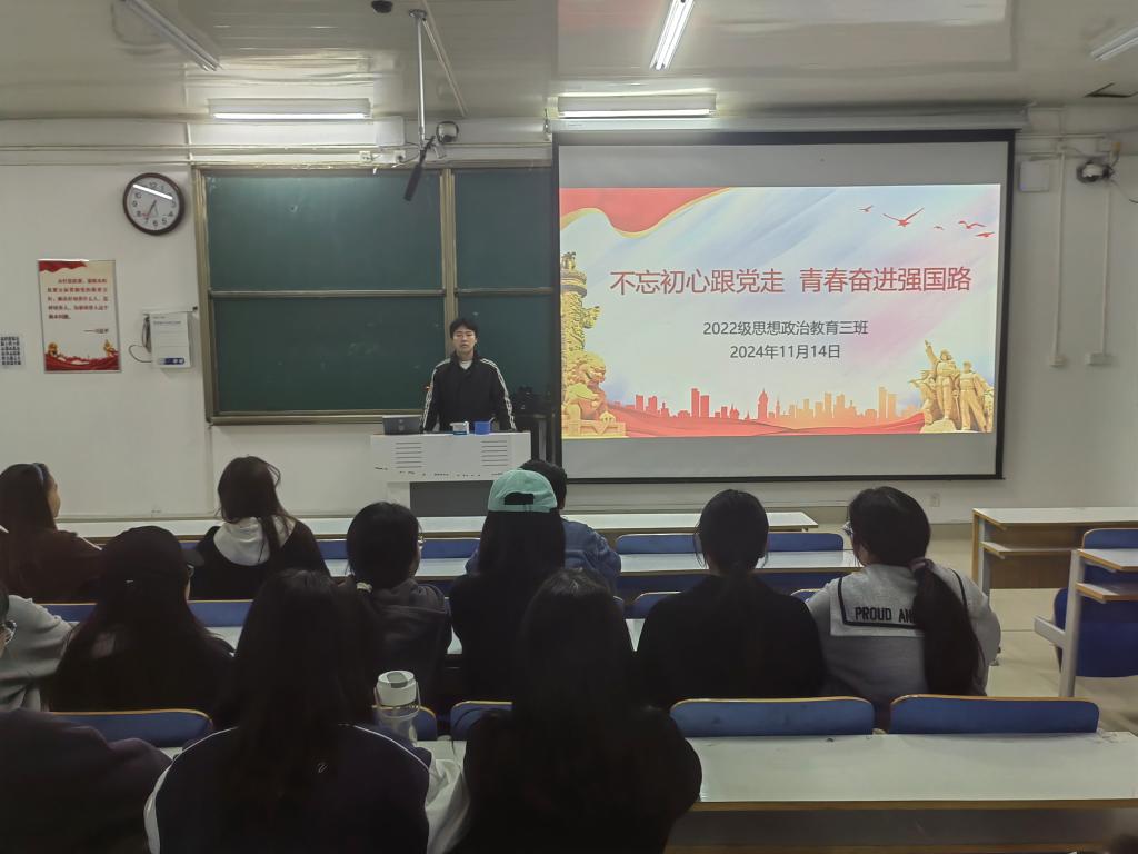 11月14日下午,太阳集团tyc59972022级思想政治教育三班在社科楼514教室开展“不忘初心跟党走,青春奋进强国路”主题团课。我院2022级思想政治教育三班全体成员共同参加此次团课,团课由团支书余浩洋主持。