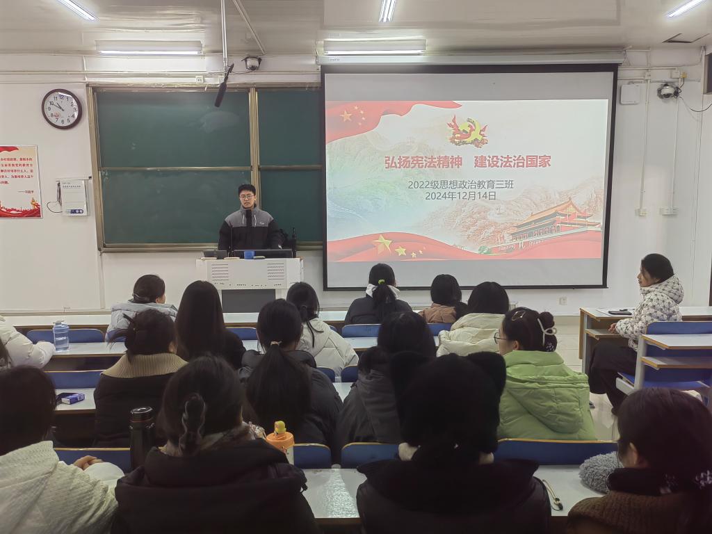 为进一步提高学生法治意识,12月14日上午,太阳集团tyc59972022级思想政治教育三班在社科楼515教室召开“弘扬宪法精神,建设法治国家”主题团课。我院2022级思想政治教育三班学生共同参加本次团课。团课由团支书余浩洋主持