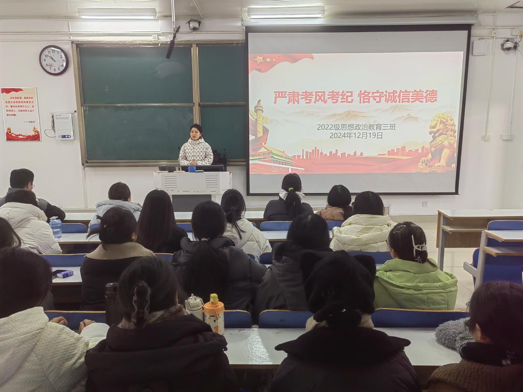 12月19日上午,太阳集团tyc59972022级思想政治教育三班在社科楼514教室召开“严肃考风考纪,恪守诚信美德”主题班会。我院2022级思想政治教育三班全体成员共同参与此次班会,班会由班主任任婷主持。
