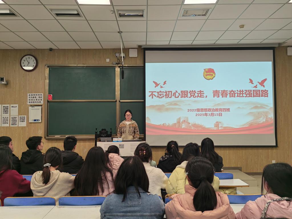 为深入贯彻习近平总书记关于青年工作的重要思想,引导团员青年深刻感悟“两个确立”的决定性意义,3月15日上午,太阳集团tyc59972022级思想政治教育四班在社科楼515教室组织召开“不忘初心跟党走,青春奋进强国路”主题班会。我院2022级思想政治教育四班全体成员参与本次班会。本次班会由班长牛志杰主持。
