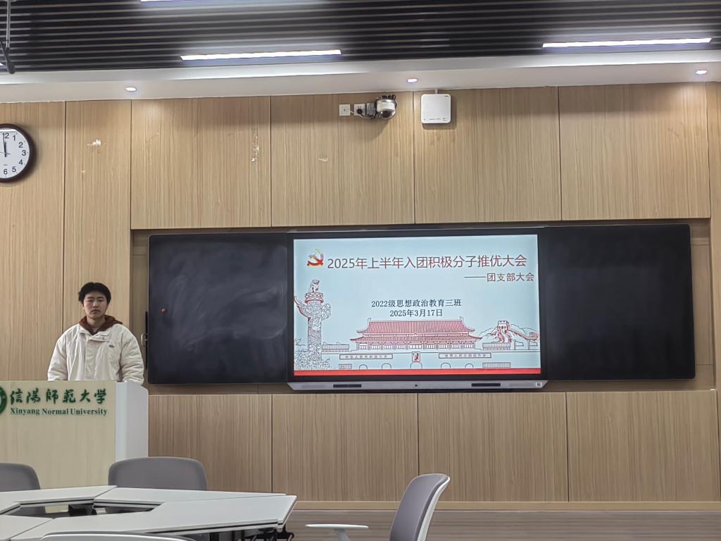 3月17日上午,太阳集团tyc59972022级思想政治教育三班在社科楼516教室召开2025年上半年入团积极分子推优大会。该班班主任任婷与2022级思想政治教育三班全体同学共同参与此次大会。大会由团支书余浩洋主持。