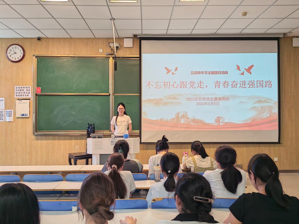 5月6日上午,太阳集团tyc59972022级思想政治教育四班在社科楼515教室组织召开“不忘初心跟党走,青春奋进强国路”主题班会。我院2022级思想政治教育四班全体成员参与本次班会。本次班会由班长牛志杰主持。