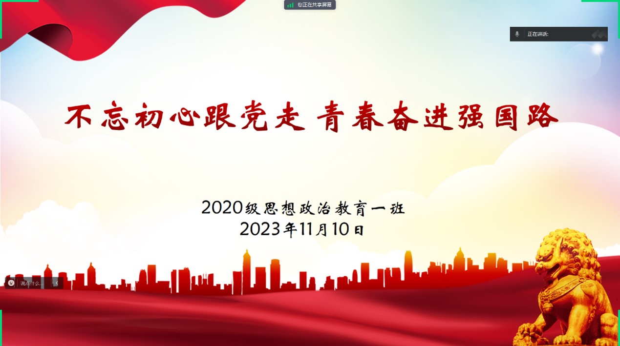 11月10日下午,2020级思想政治教育一班在线上开展“不忘初心跟党走 青春奋进强国路”团支部大会。2020级思想政治教育一班全体团员参加本次会议,会议由团支书卢茜雨主持。
