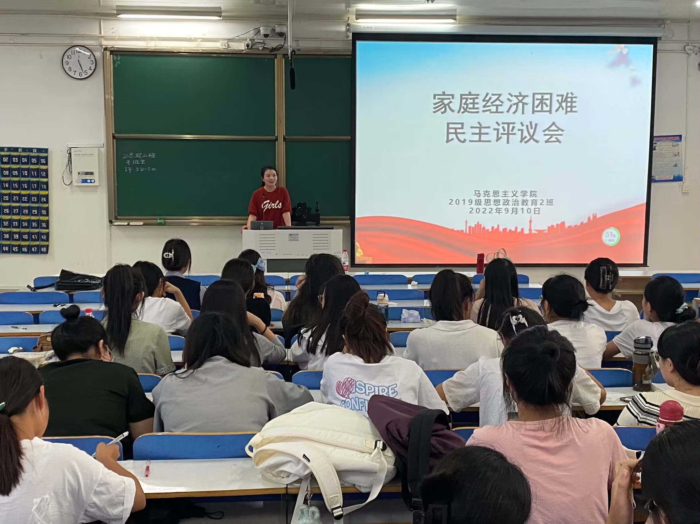 9月10日下午,太阳集团tyc59972019级思想政治教育二班在社科楼514教室召开2022年班级贫困认定民主评议会。班主任陶青青出席会议,评议小组全体成员按时到会,我院权益保障部监督员全程监督。评议会由班长吕昂主持。