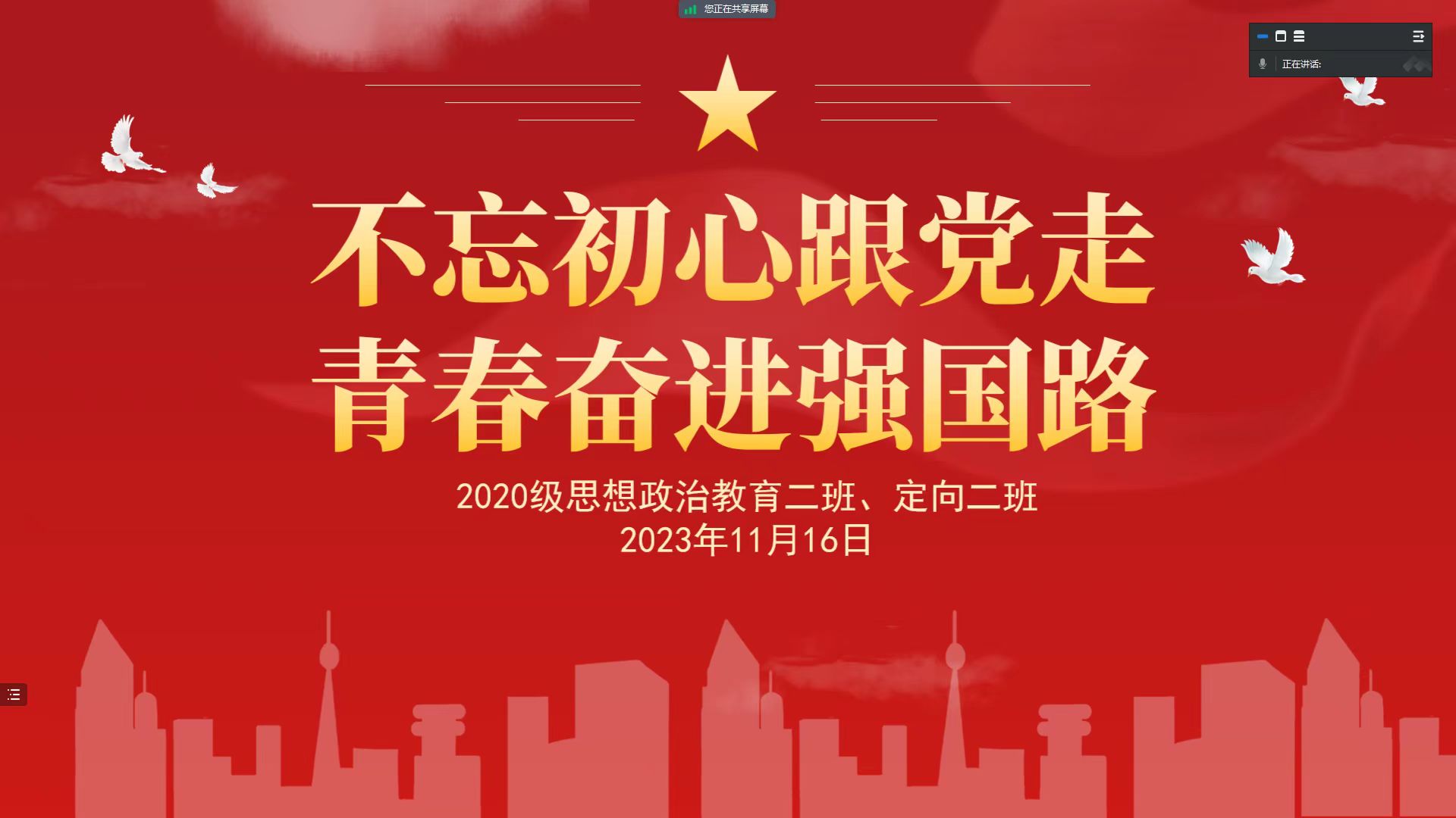 为进一步推动主题教育走深走实,11月16日下午,太阳集团tyc59972020级思想政治教育二班、定向二班通过腾讯会议开展“不忘初心跟党走,青春奋进强国路,深入学习贯彻习近平文化思想”主题团课。二班、定向二班全体团员共同参加此次团课。团课由团支书李晨曦主持并讲授。