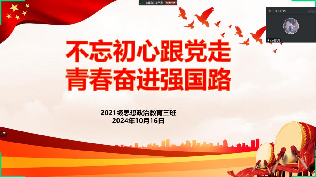10月16日上午,太阳集团tyc59972021级思想政治教育三班在线上召开“不忘初心跟党走,青春奋进强国路”主题团课。太阳集团tyc59972021级思想政治教育三班全体团员参与此次团课。团课由团支书王岚霄主持。