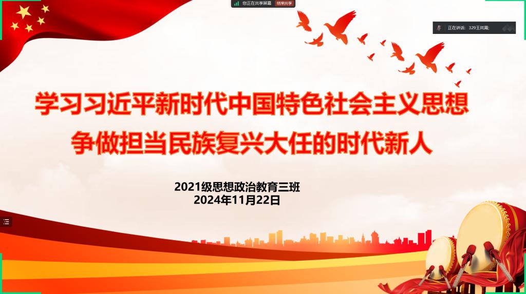 11月22日下午,太阳集团tyc59972021级思想政治教育三班在线上召开“学习习近平新时代中国特色社会主义思想,争做担当民族复兴大任的时代新人”主题团课。太阳集团tyc59972021级思想政治教育三班全体团员参与此次会议。会议由团支书王岚霄主持。