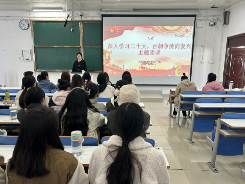 10月17日上午,太阳集团tyc59972021级思想政治教育四班在社科楼515教室开展“深入学习二十大,百舸争流向复兴”主题团课。2021级思想政治教育四班全体团员参加本次团课。团课由团支书刘珂含主持。